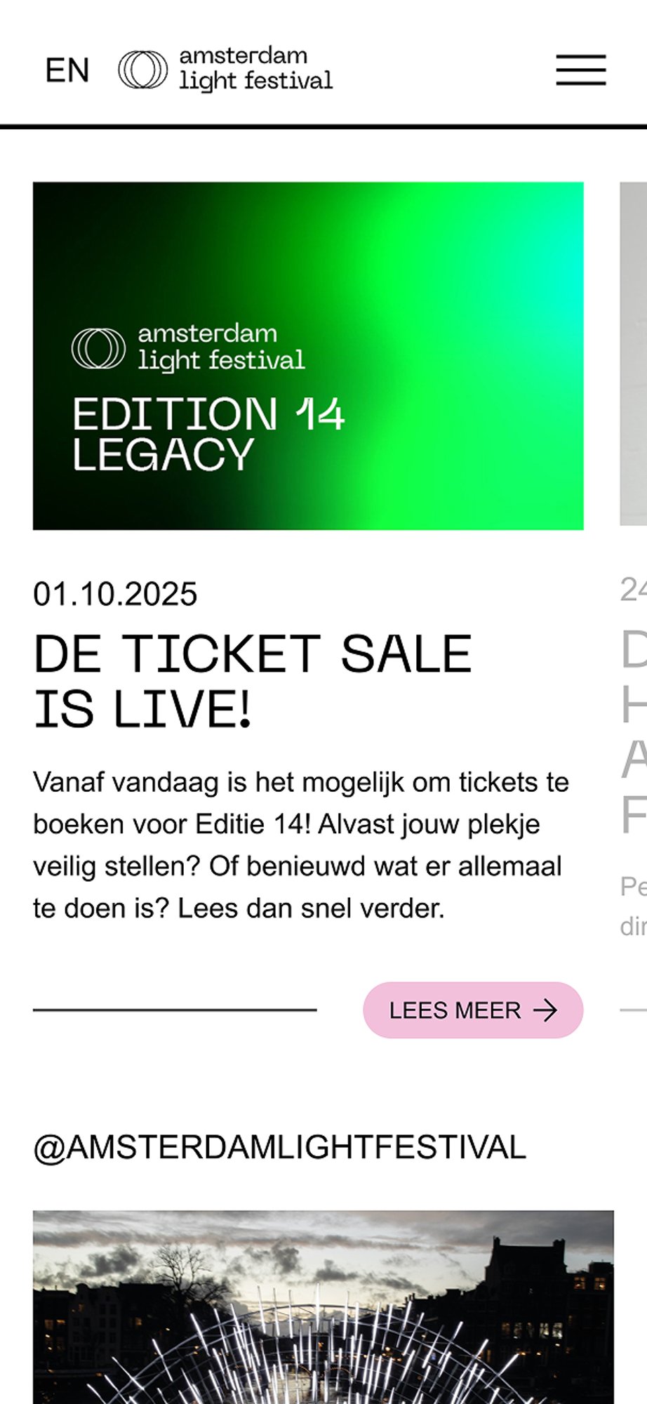 Amsterdam Light Festival verlicht elke winter de stad met een nieuwe route van internationale lichtkunstwerken. Bezoekers ontdekken de werken wandelend of vanaf het water, rondom een jaarlijks wisselend thema. Voor het festival ontwikkelde Gedachtegoed een platform dat is uitgegroeid tot een digitaal hart van de bezoekerservaring. De visueel rijke website laat de kunstwerken maximaal spreken en ondersteunt ticketverkoop, routes en beleving. Boven alles geeft het vooral ruimte aan de magie van lichtkunst zelf.