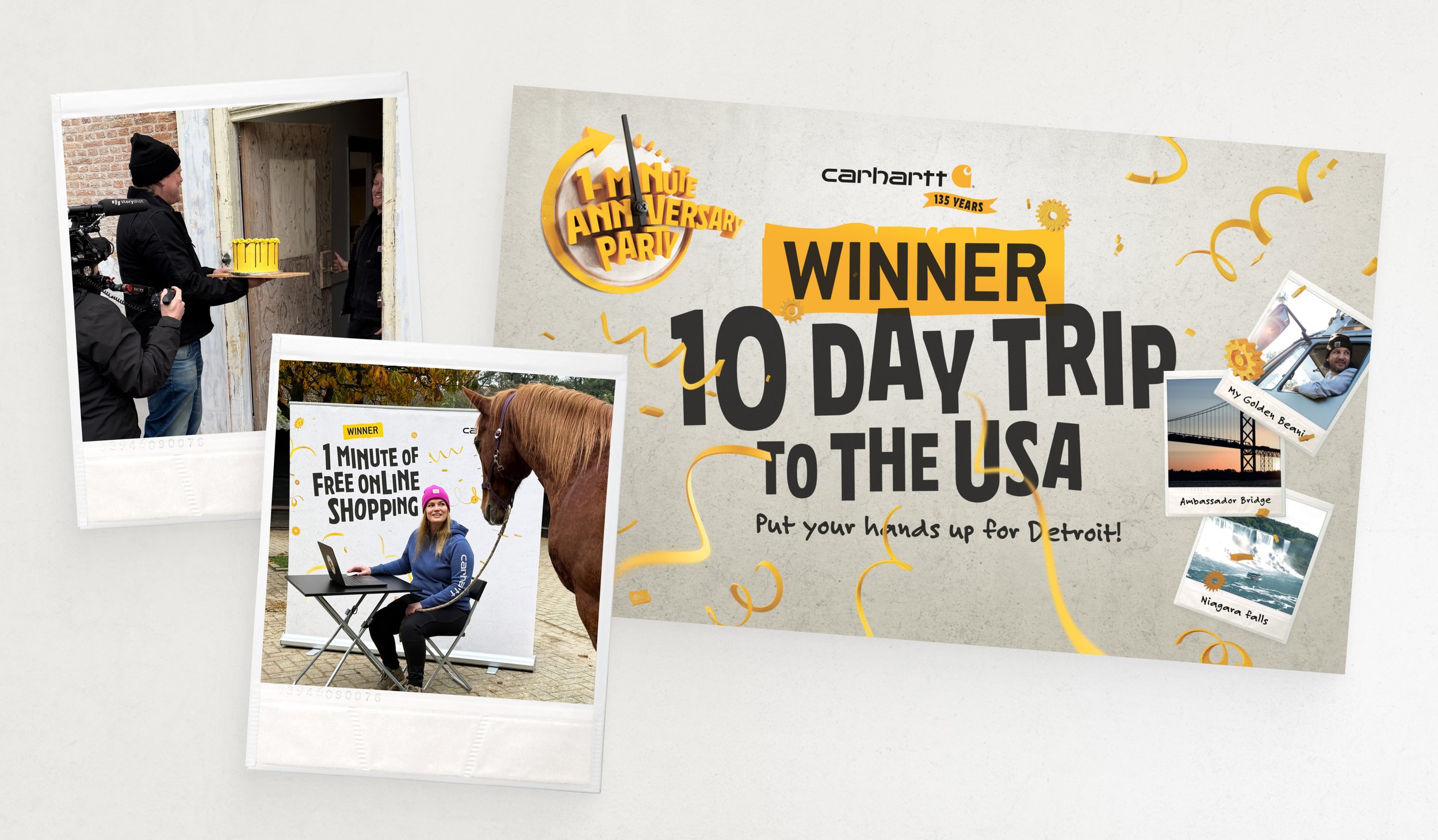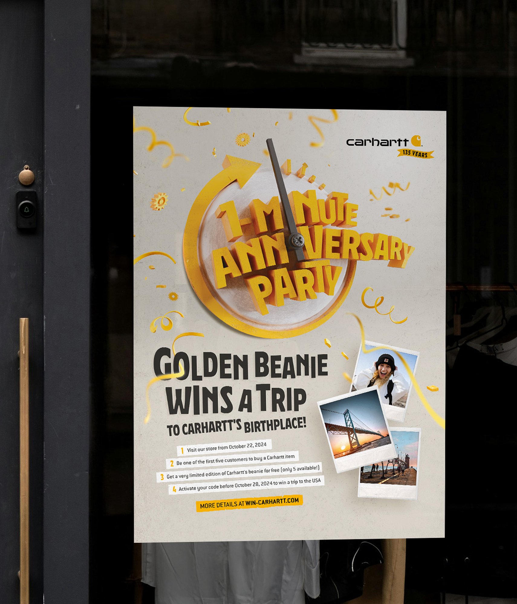 Voor haar 135e verjaardag organiseerden we voor Carhartt een jubileum op z’n Carhartts: kort en krachtig. Harde werkers hebben tenslotte geen tijd voor uitgebreide feestjes. Op 29 oktober 2024 om precies 12:00 uur vond de 1-Minute Anniversary Party plaats. Een feestje van zestig seconden vol verrassingen. Van reis naar Amerika, 1 minuut online shoppen tot taart op de werkvloer.
