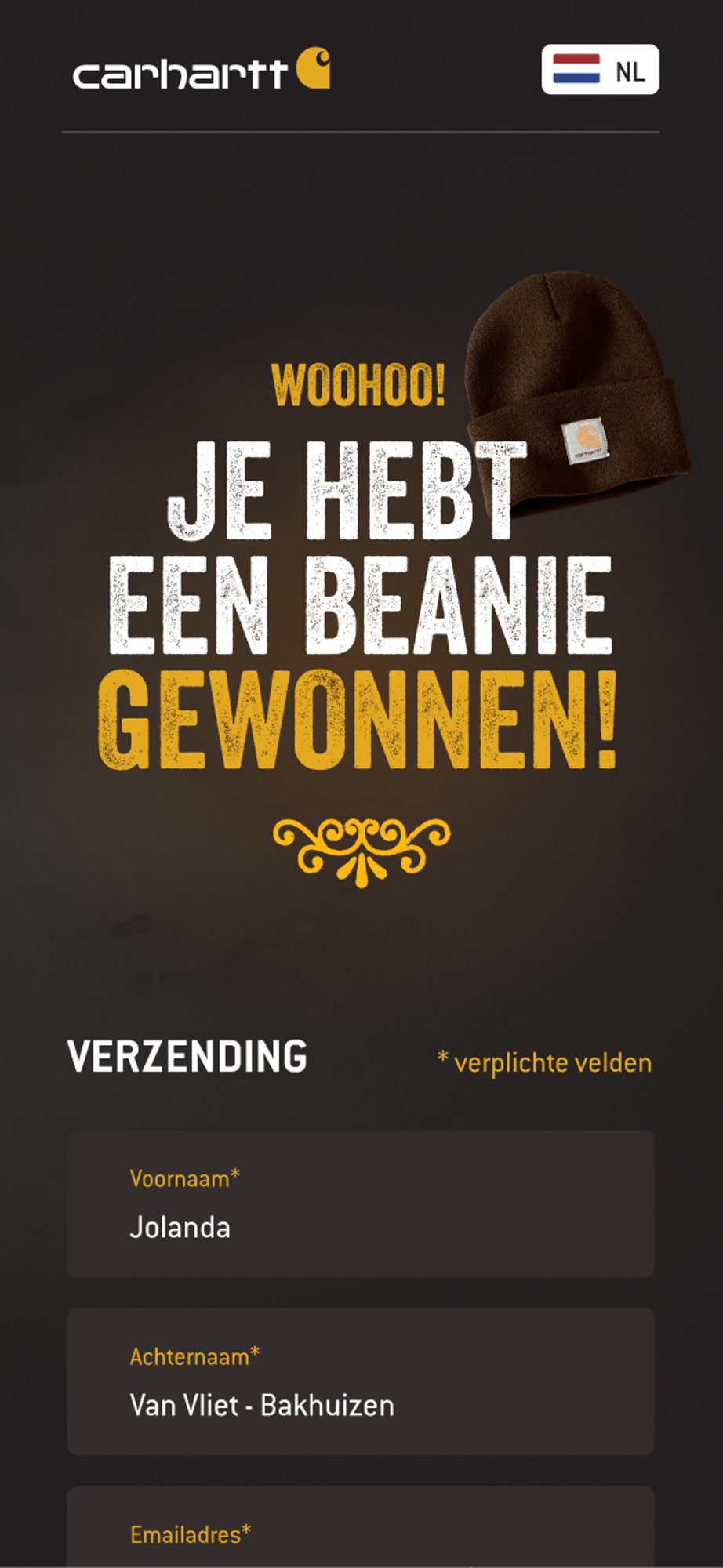 Met een kraskaart zagen klanten online direct of ze een prijs wonnen. Met als hoofdprijs een professionele klusser die hun lijst ter waarde van €1.500 kwam wegwerken. Gedachtegoed bedacht het creatieve concept, het spelmechanisme, de wincodeproductie, de actiewebsite en zorgde dat de gewonnen klussen in de drie deelnemende landen werden uitgevoerd. Een actie die de nuchtere Carhartt-mentaliteit perfect vertaalde: less talk, more do. Oh ja, leuk om te weten, het beeld van de klusser onder de boom is geen AI.