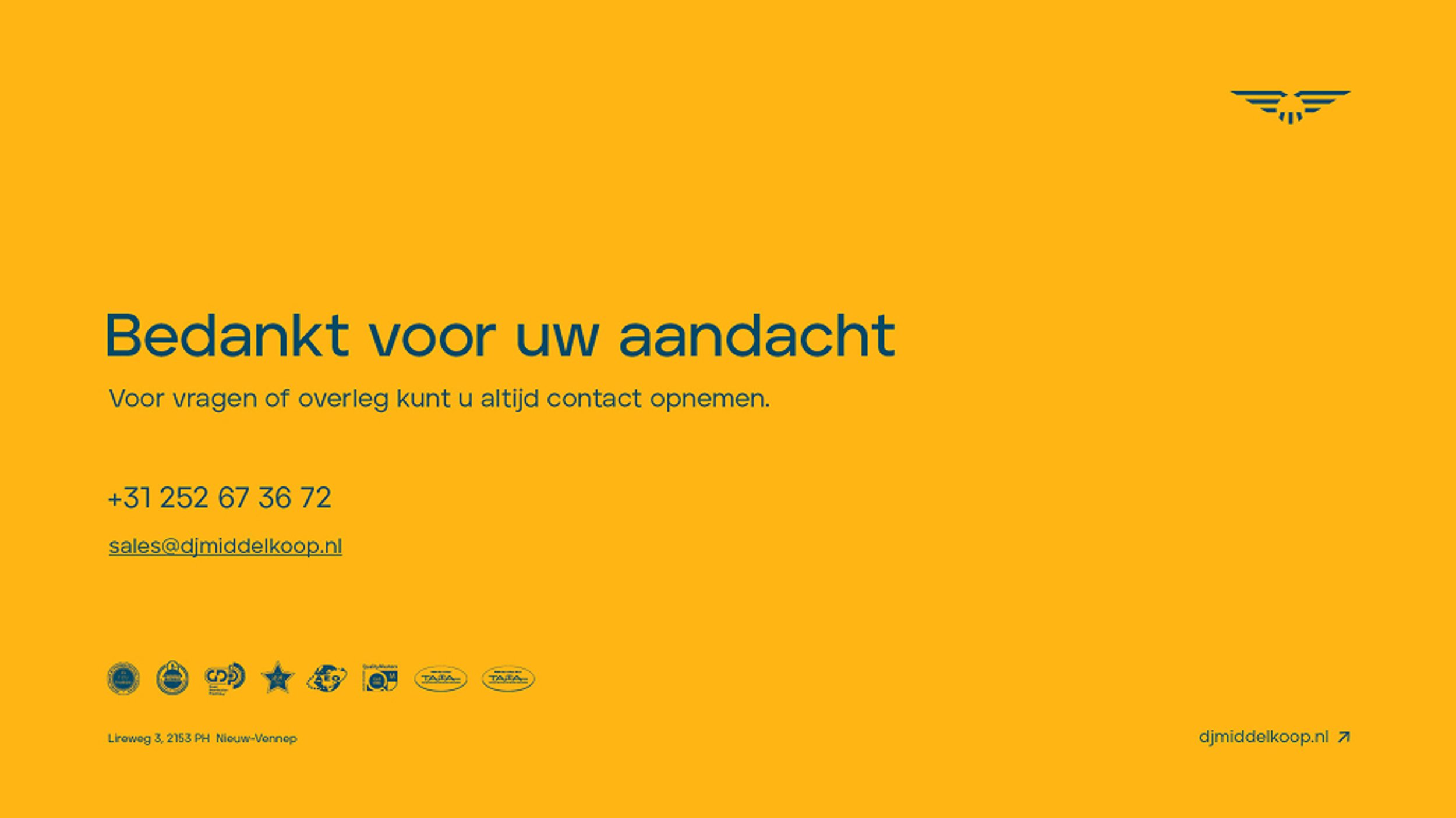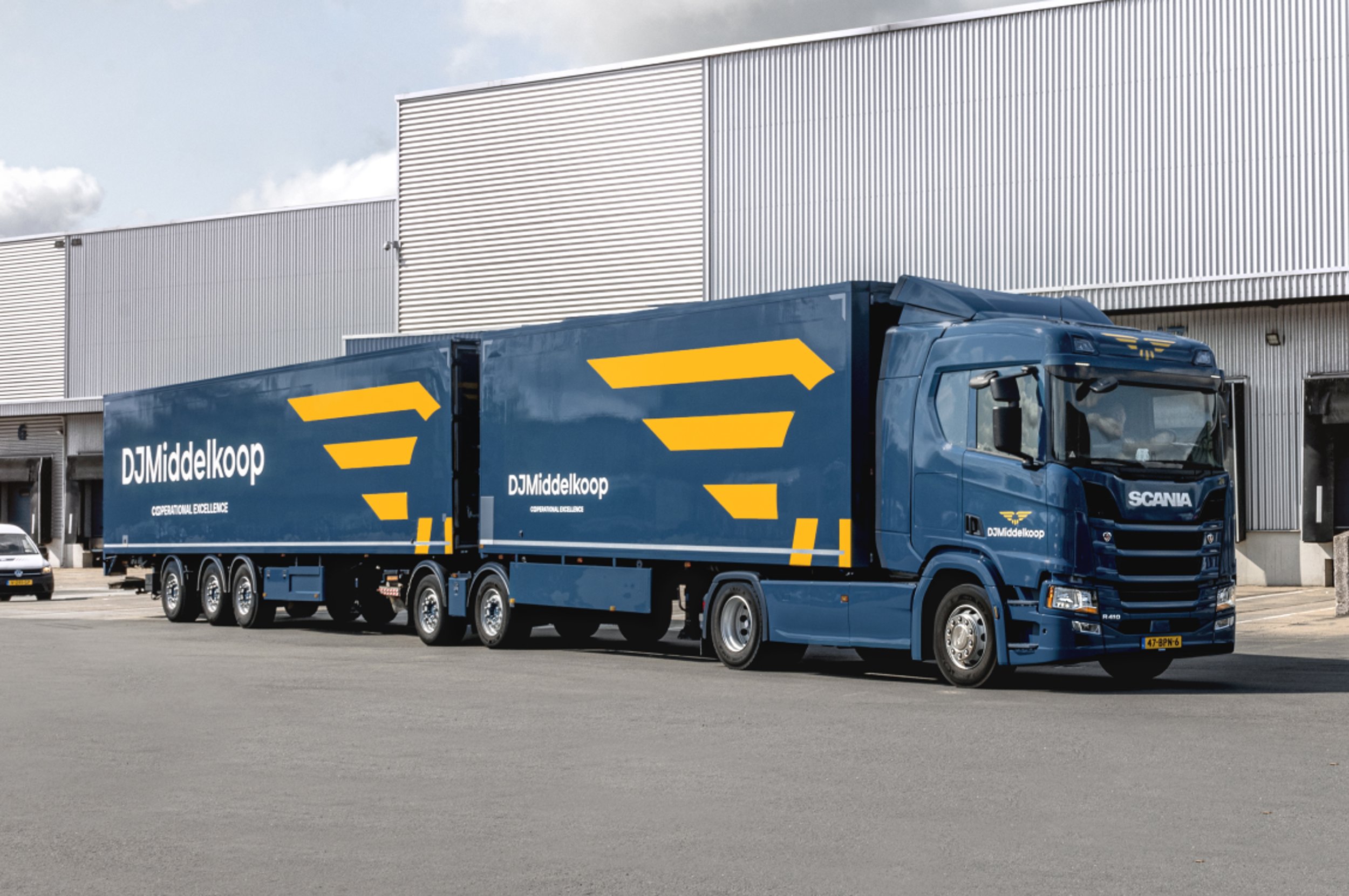 Met imposante vrachtwagens en trailers beschikt Middelkoop over duizenden vierkante meters aan rijdende zichtbaarheid. Juist daarom werd de vernieuwing van de identiteit niet gezocht in iets volledig nieuws, maar in het versterken van wat al sterk was. Het nieuwe, gestileerde logo kreeg letterlijk en figuurlijk meer ruimte. Door het beeldmerk groot en soms zelfs ‘aflopend’ op het materiaal te plaatsen, benadrukt het merk dat het verder durft te kijken dan zijn eigen schakel in de keten. 'Less is more' is de nieuwe visuele leidraad. Minder details, meer impact.