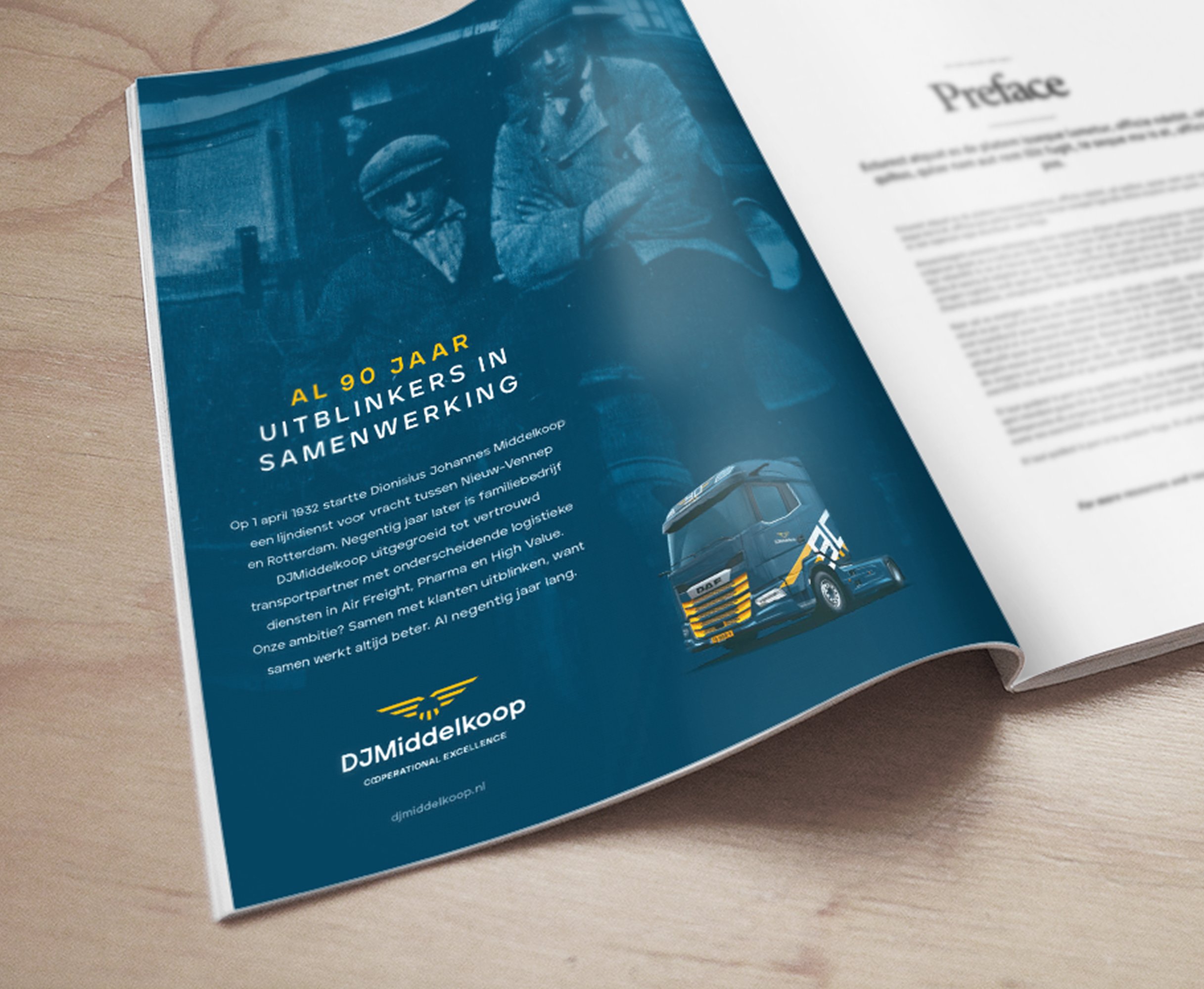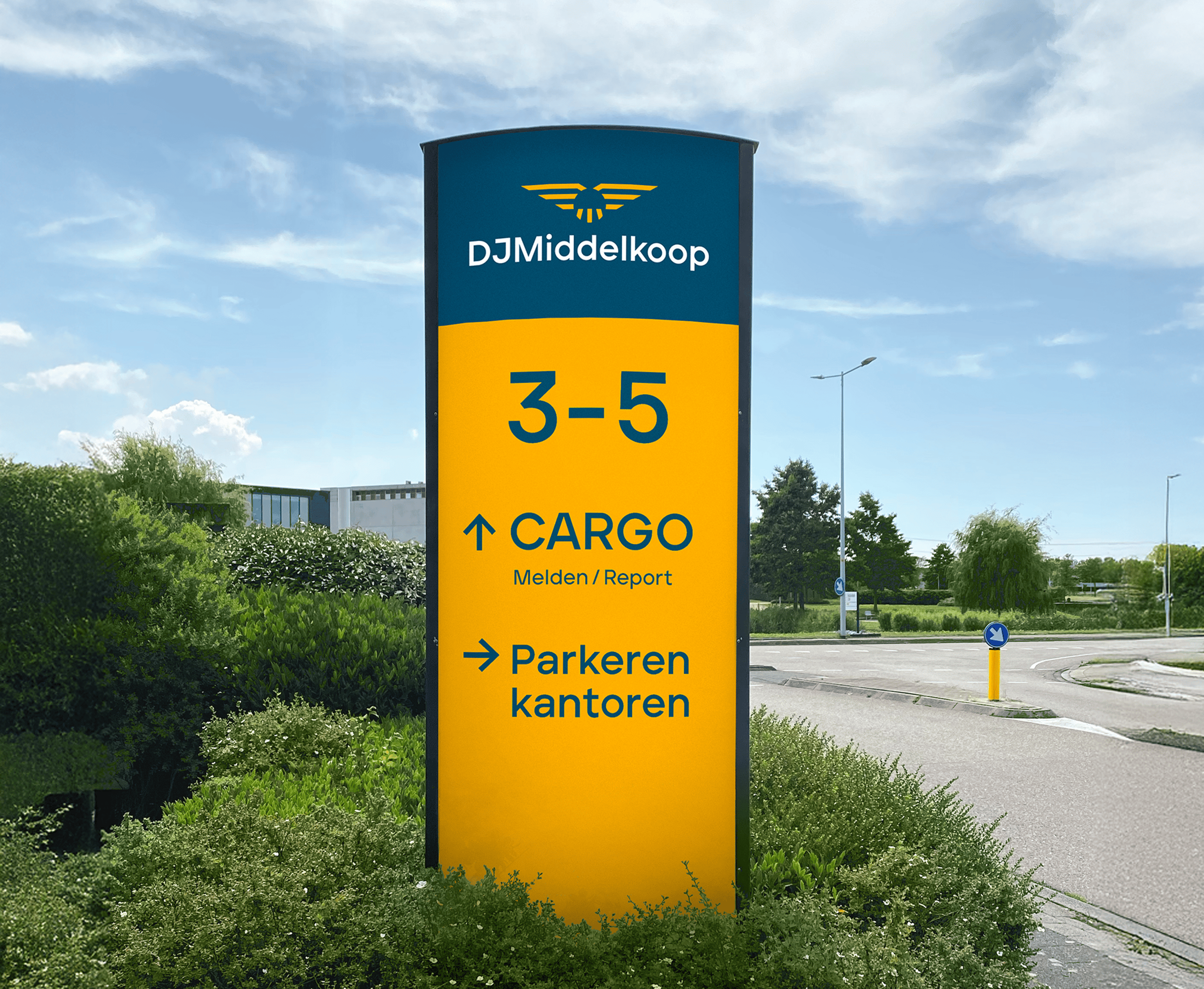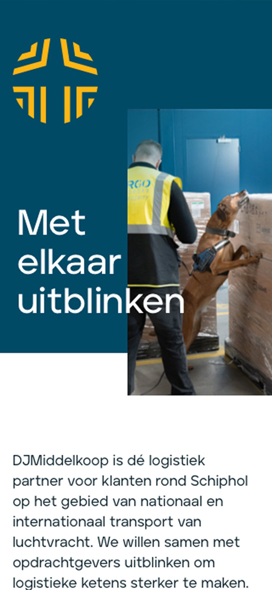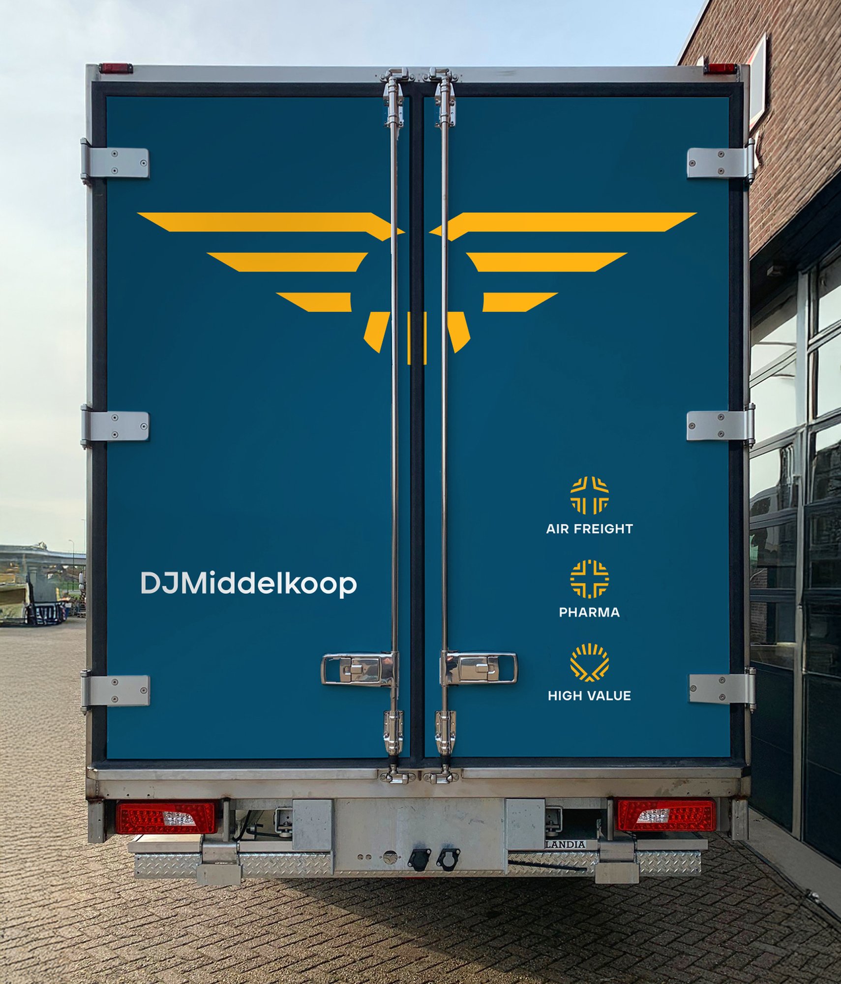 We ontrafelden stap voor stap de kern van DJMiddelkoop: een bedrijf dat verder kijkt dan de eigen schakel in de logistieke keten en altijd wil uitblinken in samenwerking. Deze ambitie vormde de basis voor de nieuwe merkstrategie en de pay-off Cooperational Excellence. De rebranding is gestoeld op de gedachte van ‘Less is More’. Een strakke, moderne en robuuste evolutie van de bestaande identiteit. Belangrijke aanpassing in de merkhiërarchie was om alle bestaande diensten te labelen als 'Air Freight' en gelijkwaardig te presenteren als de nieuwe labels 'Pharma' en 'High Value'.