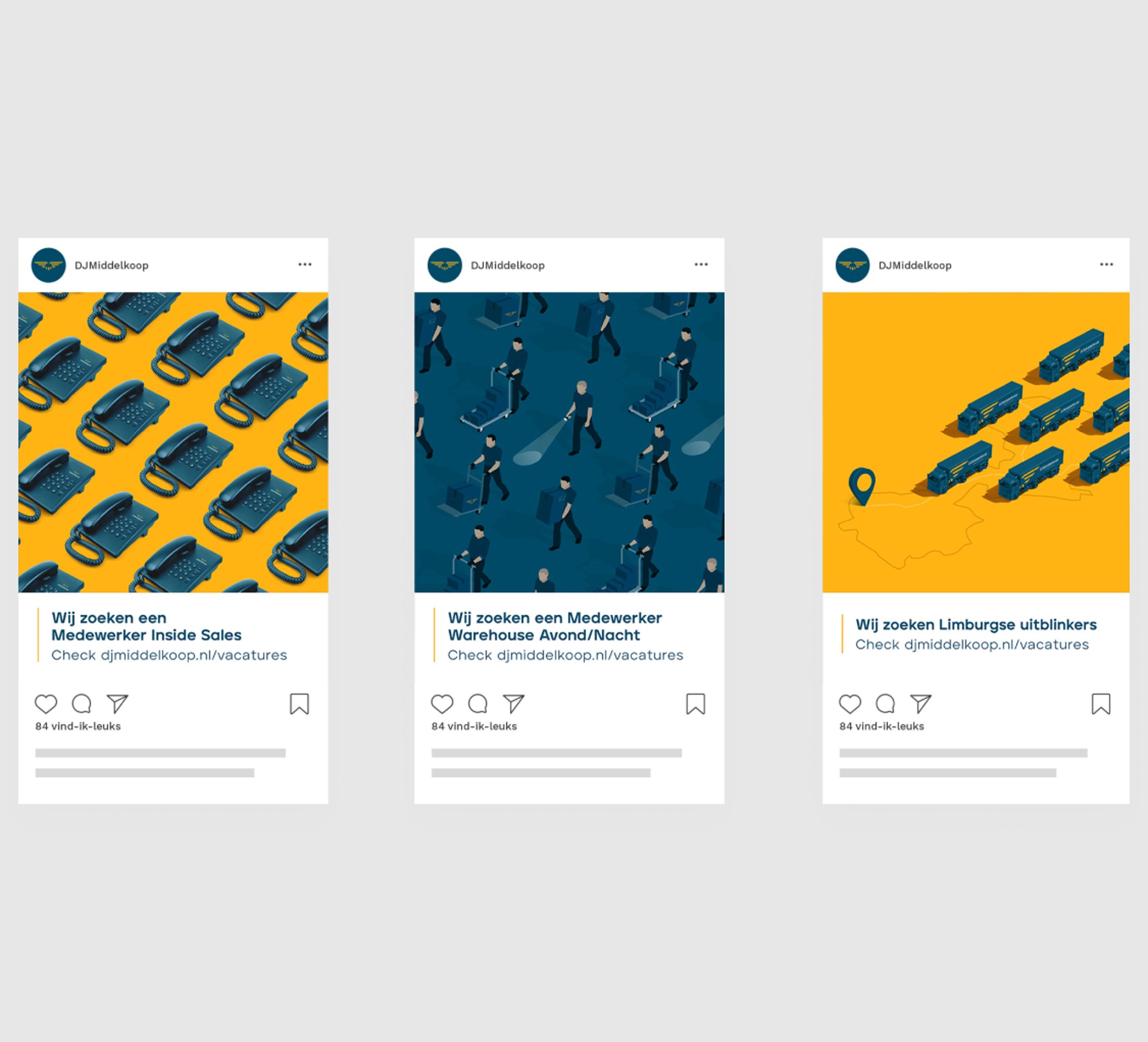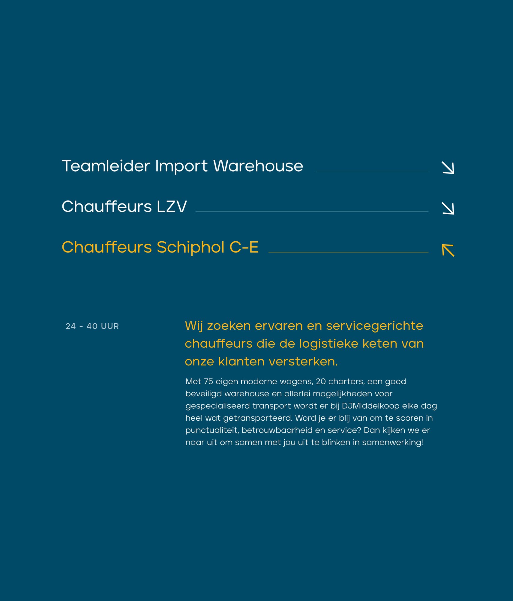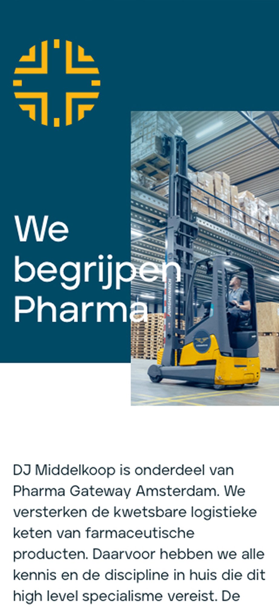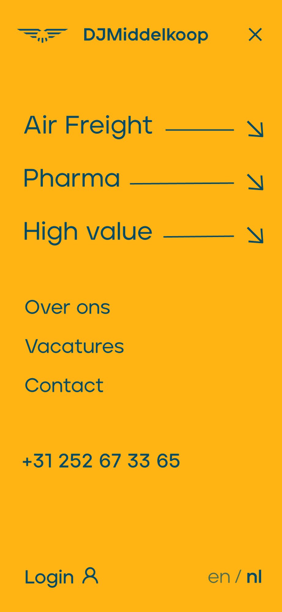 We ontrafelden stap voor stap de kern van DJMiddelkoop: een bedrijf dat verder kijkt dan de eigen schakel in de logistieke keten en altijd wil uitblinken in samenwerking. Deze ambitie vormde de basis voor de nieuwe merkstrategie en de pay-off Cooperational Excellence. De rebranding is gestoeld op de gedachte van ‘Less is More’. Een strakke, moderne en robuuste evolutie van de bestaande identiteit. Belangrijke aanpassing in de merkhiërarchie was om alle bestaande diensten te labelen als 'Air Freight' en gelijkwaardig te presenteren als de nieuwe labels 'Pharma' en 'High Value'.